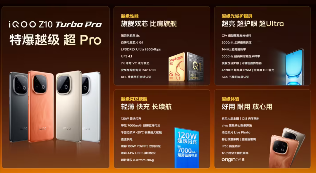 骁龙8s Gen4、自研电竞芯片Q1、7000mAh电池+120W快充。
