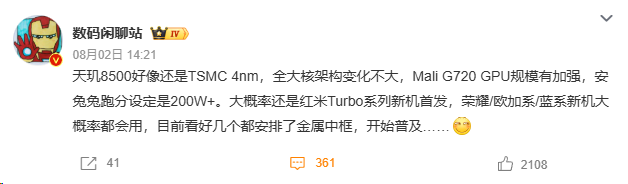 Turbo 5大概率会首发天玑8500,台积电4nm工艺制程、全大核架构、安兔兔跑分预计在200W以上。
