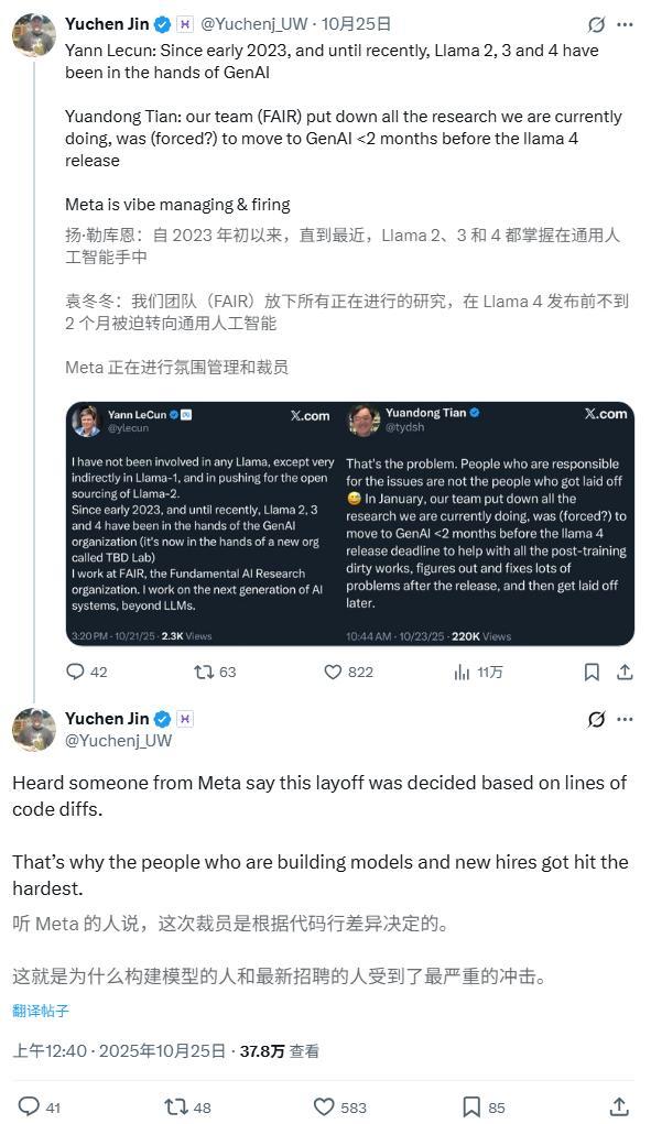 IT之家 10 月 26 日消息,Hyperbolic CTO Yuchen Jin 昨日透露,Meta 内部人士称此次裁员是基于代码差异行数(lines of code diffs)而决定,因此模型开发者和新员工受到的冲击最为严重。