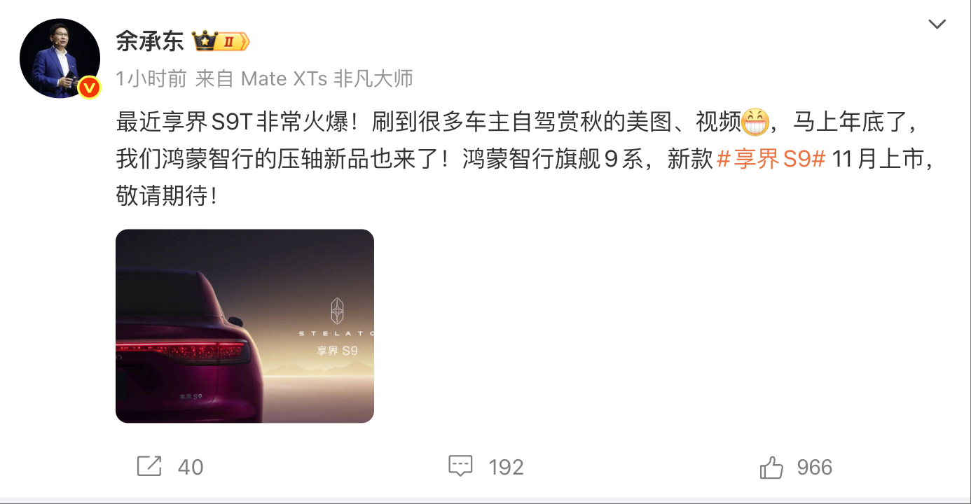 凤凰网科技讯 10月27日,华为常务董事、终端BG董事长余承东发文宣布:鸿蒙智行的“压轴新品”新款享界S9将于11月上市。