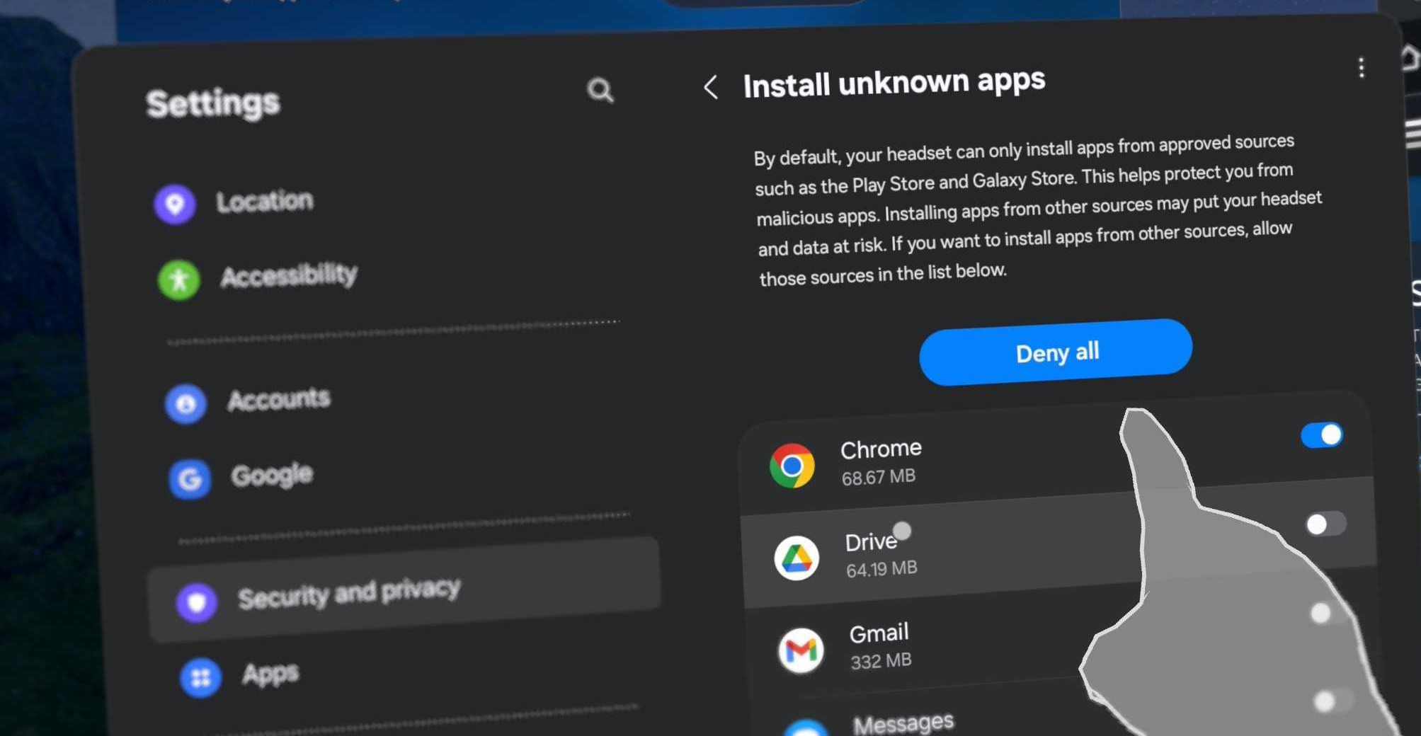 UploadVR 指出,在 Galaxy XR 上,用户只需通过内置浏览器(如 Chrome)下载 APK,并在「安全与隐私」设置中授权安装「未知应用」,即可完成安装。