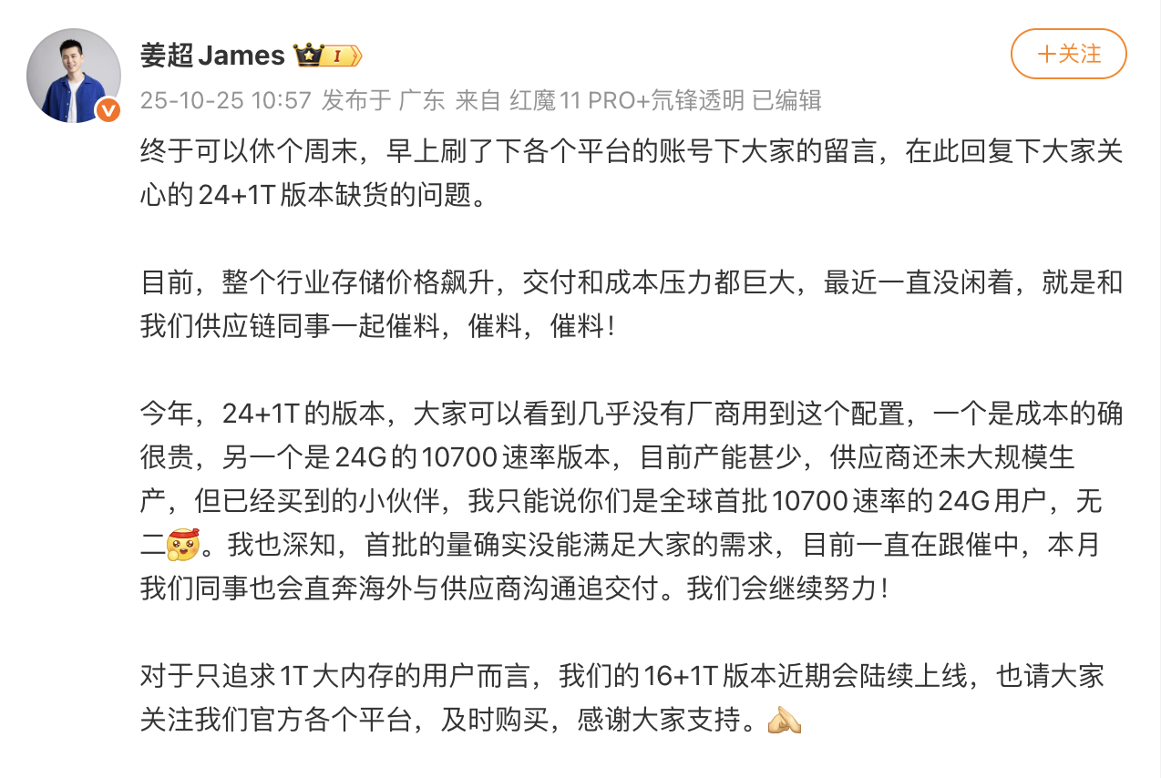 日前,红魔游戏手机产品总经理姜超在微博发文,就红魔游戏手机 24GB + 1TB 版本近期出现缺货的情况进行回复。