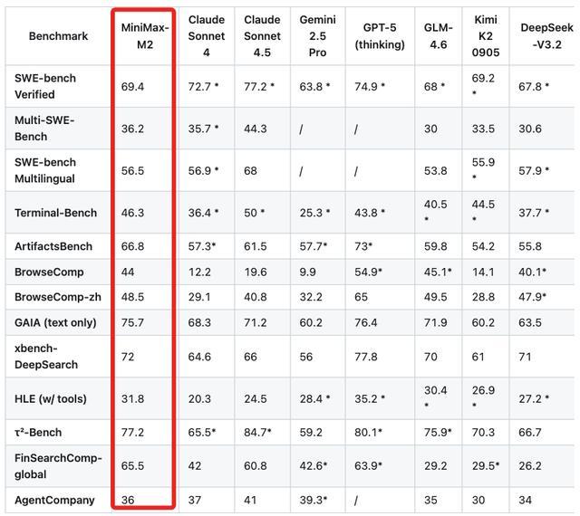 在权威基准测评中,MiniMax-M2的测试成绩赶超Gemini 2.5 Pro、DeepSeek-V3.2等领先模型,接近GPT-5(thinking)模型性能,据称可提供匹敌这些模型的端到端工具使用性能,同时部署和扩展更便捷。