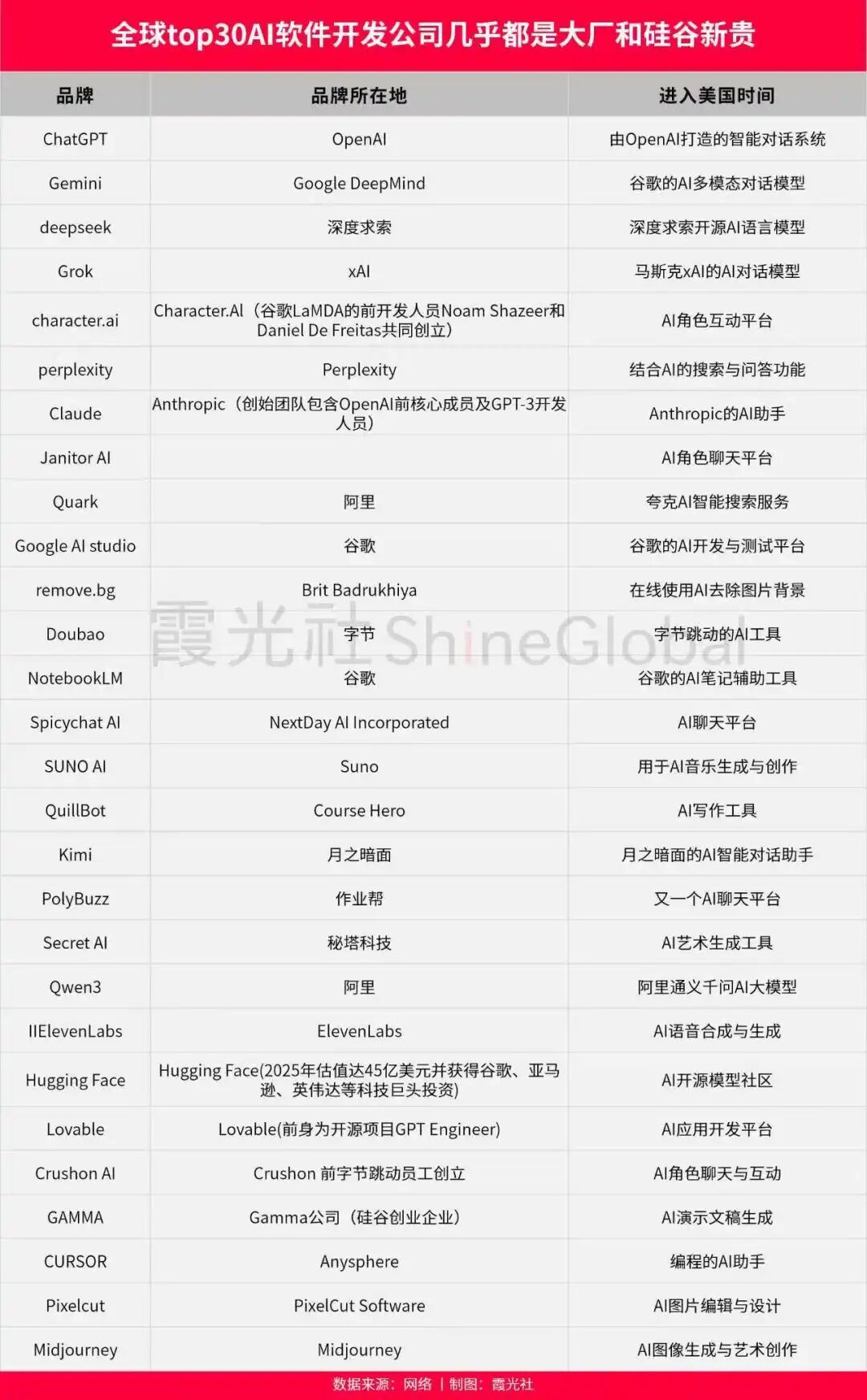 统计2025年8月a16z发布的第五版互联网AI产品TOP50榜单,排名前30的软件也几乎被硅谷科技巨头、硅谷创业产业和国内互联网大厂包揽。