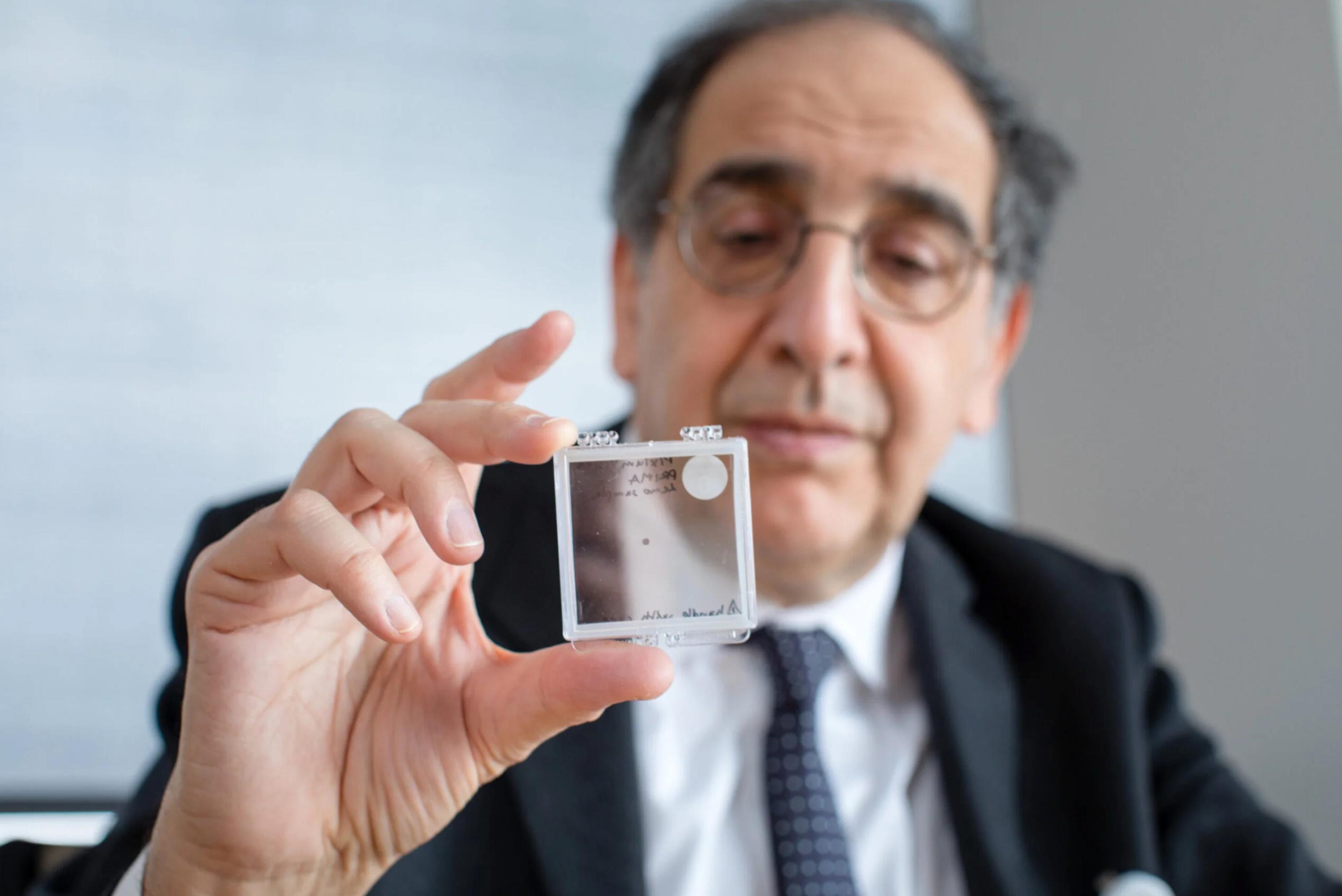 视网膜下微型芯片,它能将近红外光变成电刺激,相当于一个替代感光细胞的电子感受器