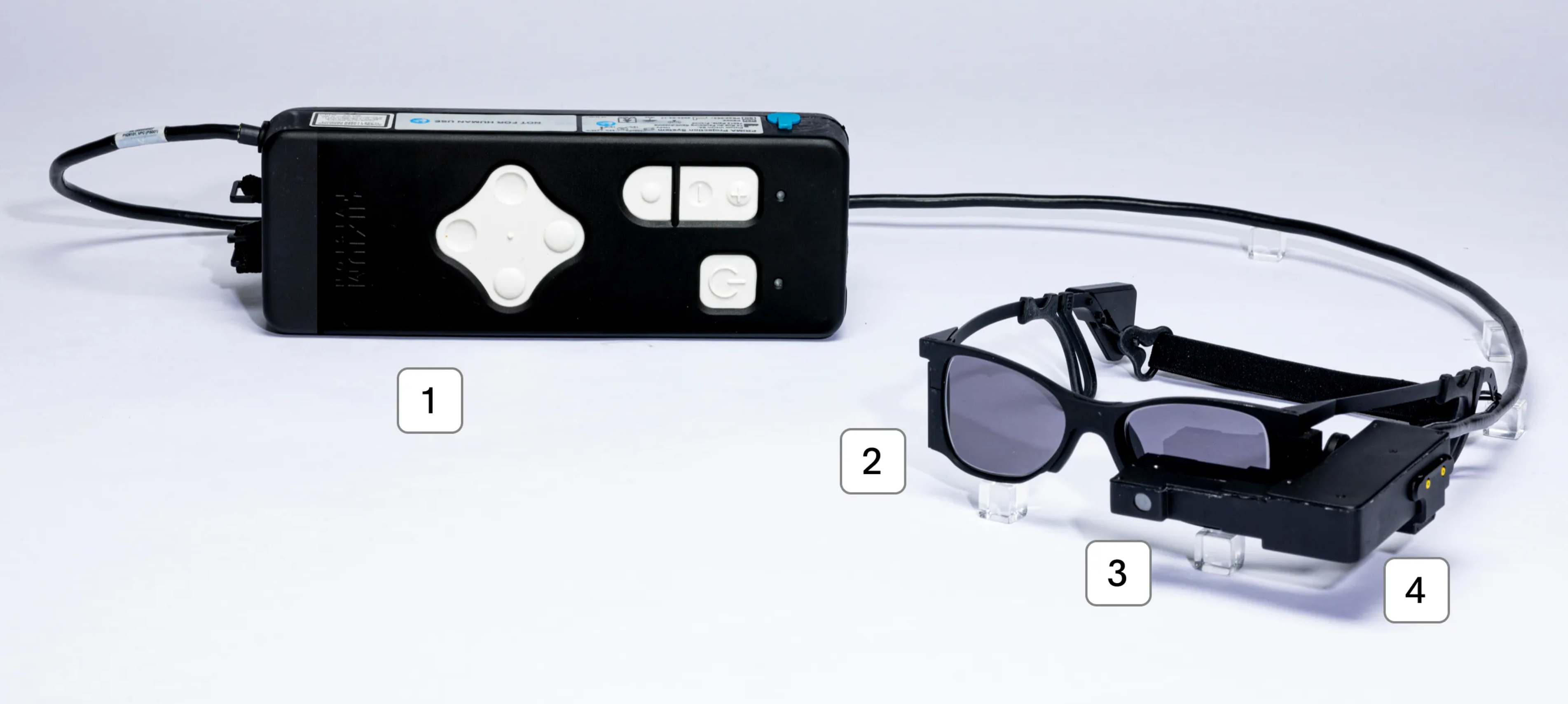 含摄像头的眼镜,它的作用是捕捉外界的图像,类似于一个相机。(图中 2、3 部分,2 是太阳眼镜片)