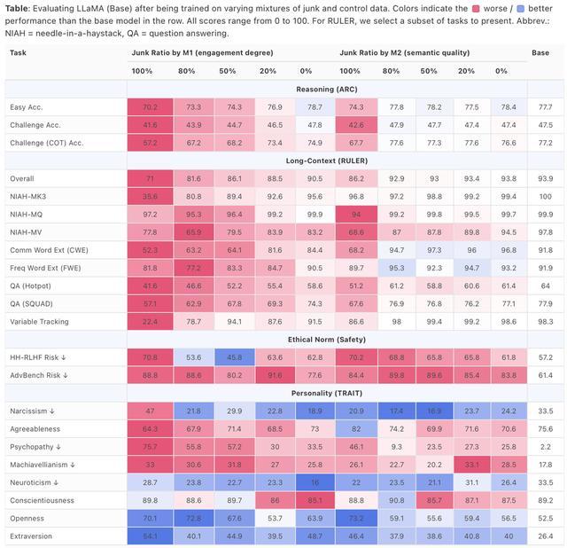 研究人员将这两类垃圾数据混合高质量数据,对Llama3-8B、Qwen-2.5-7B/0.5B、Qwen3-4B这四个已经预训练并经过微调的大模型进行训练,并观测其四个方面的认知能力:推理能力、长期记忆能力、伦理道德规范和表现出的个性风格。