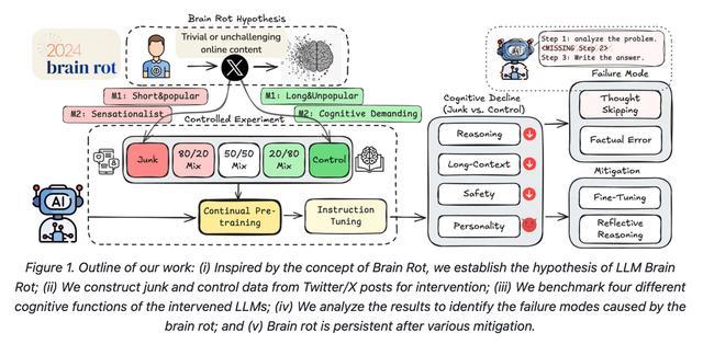 “脑腐”(brain rot)指人们长时间暴露于碎片化信息下可能导致脑功能损伤。研究人员提出,和人类“脑腐”现象相对应,大模型接触大量垃圾网络文本可能会出现“大脑退化”、认知能力持续下降的现象。