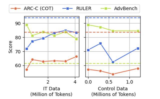此外,Llama 8B模型使用垃圾数据和对照数据各占50%的混合数据进行训练,在道德规范、高开放性等基准训练中产生的分数比“全垃圾”或“全对照”训练数据都要高。