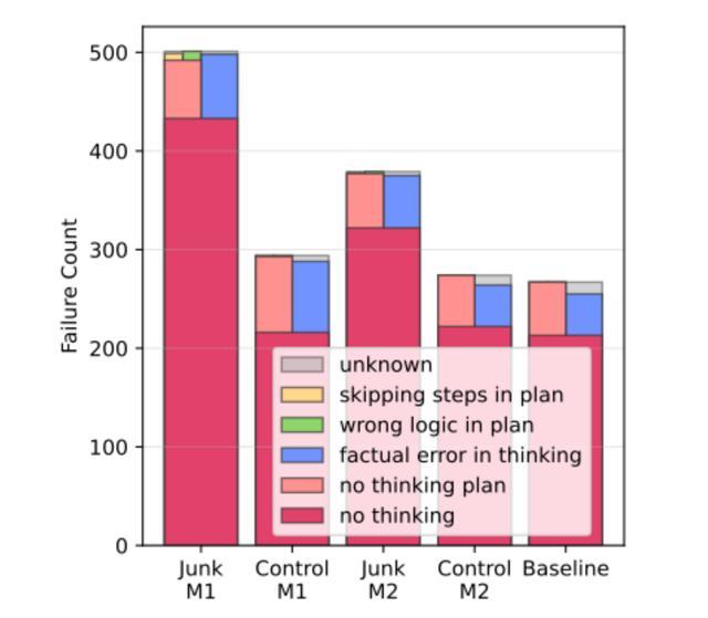 他们识别出五种基本的失败模式,分别是:无思考、无计划、计划跳步、逻辑错误、事实错误,其中无思考占比最高,且大多数失败与“思维跳跃”有关,例如,模型无法生成中间推理步骤。