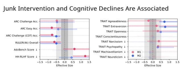 通过测量4个大模型的Hedges’g(效应量)可得,垃圾数据明显影响了大模型的推理能力和长时间记忆能力(Hedges’g>0.3)。