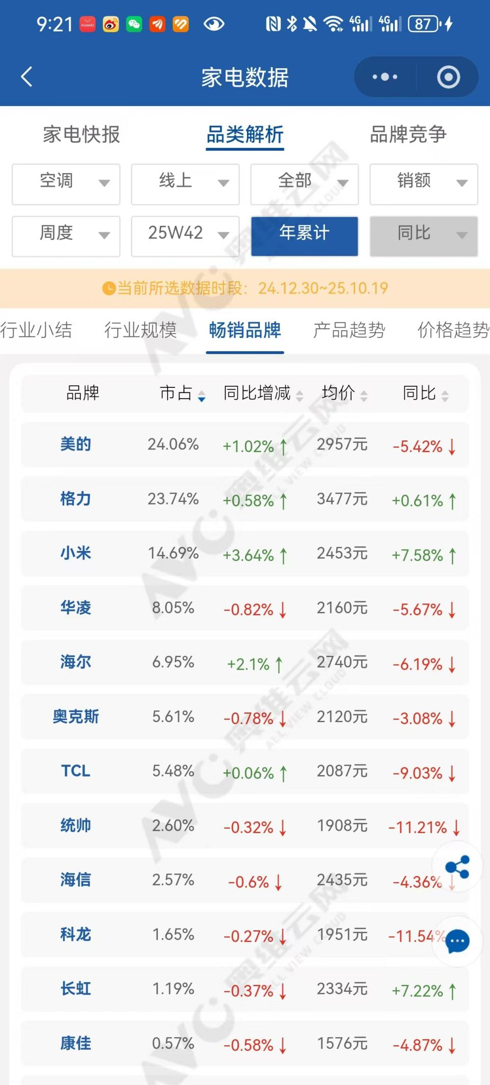 10月25日,雷达财经查询奥维云网发现,2024年12月30日至今年10月19日期间,美的以24.06%的市占率位列第一,格力以23.74%的市占率紧随其后,小米以14.69%的市占率位列第三,与格力存在较大差距。