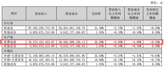 分产品来看,占营收比例最大、覆盖家用空调销售的消费电器业务增长乏力,该板块上半年营收762.8亿元,同比下滑5.09%,毛利率下降0.29%至33.20%。