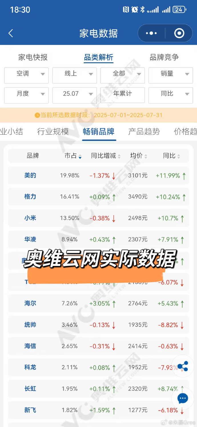 朱磊晒出的截图显示,7月格力空调线上市占率为16.41%,小米为13.50%,小米并未反超。