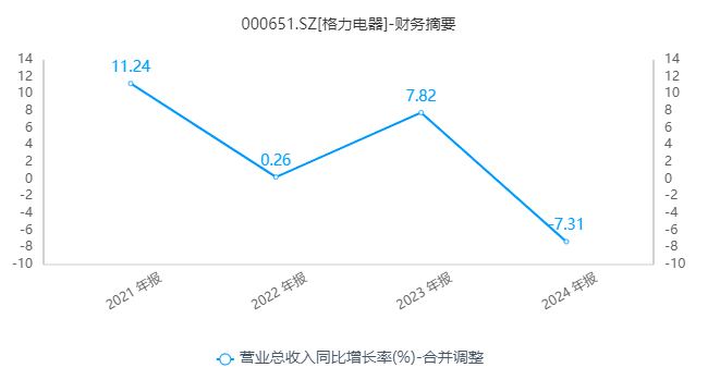 同花顺iFinD数据显示,2021年至2024年,格力分别录得营收1896.54亿元、1901.51亿元、2050.18亿元、1900.38亿元,同比增长率分别为11.24%、0.26%、7.82%、-7.31%。