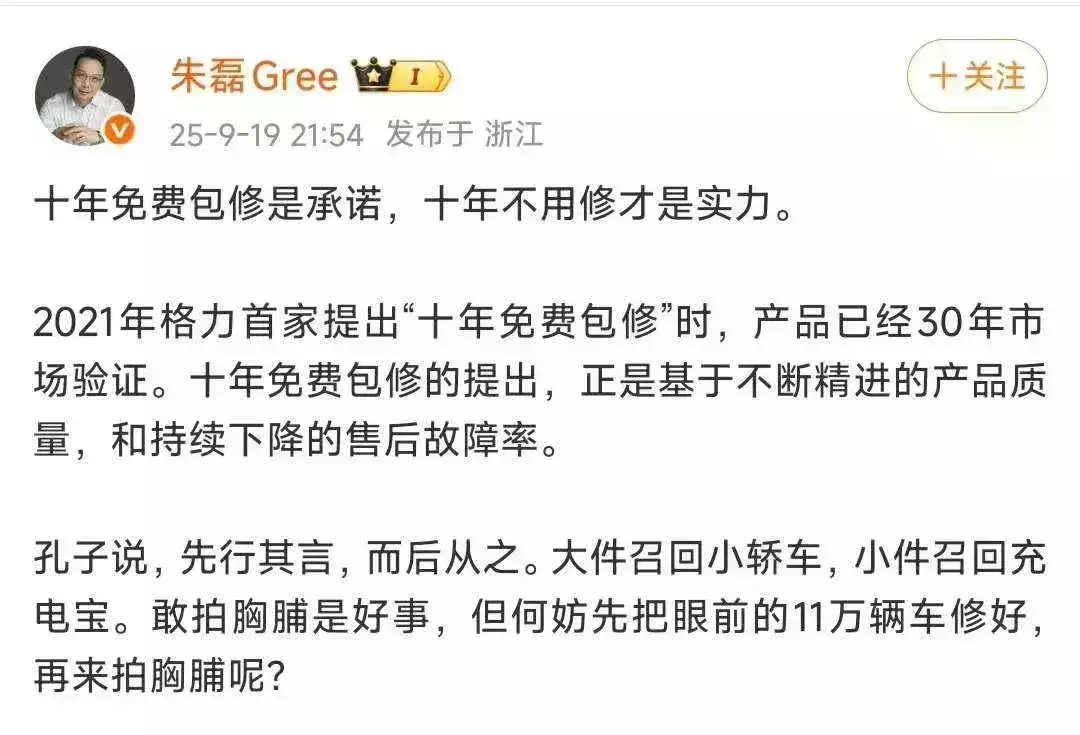 2025年9月19日,小米集团总裁卢伟冰在直播中宣布米家空调全系开启“10 年免费包修”,此举直指格力2021年构筑品牌护城河—— “十年免费包修”政策。此外,小米还更进一步,将中央空调也纳入保修范围。
