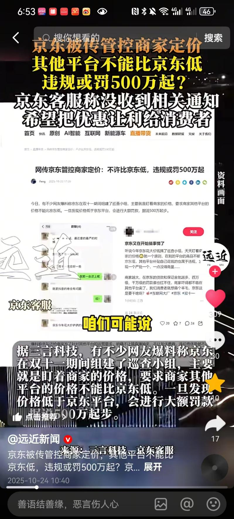 “网传这么几个图,据说还是内部聊天记录,不允许其他平台价格比京东低。”近日,抖音平台上出现了一批视频,称京东双11大搞“二选一”。