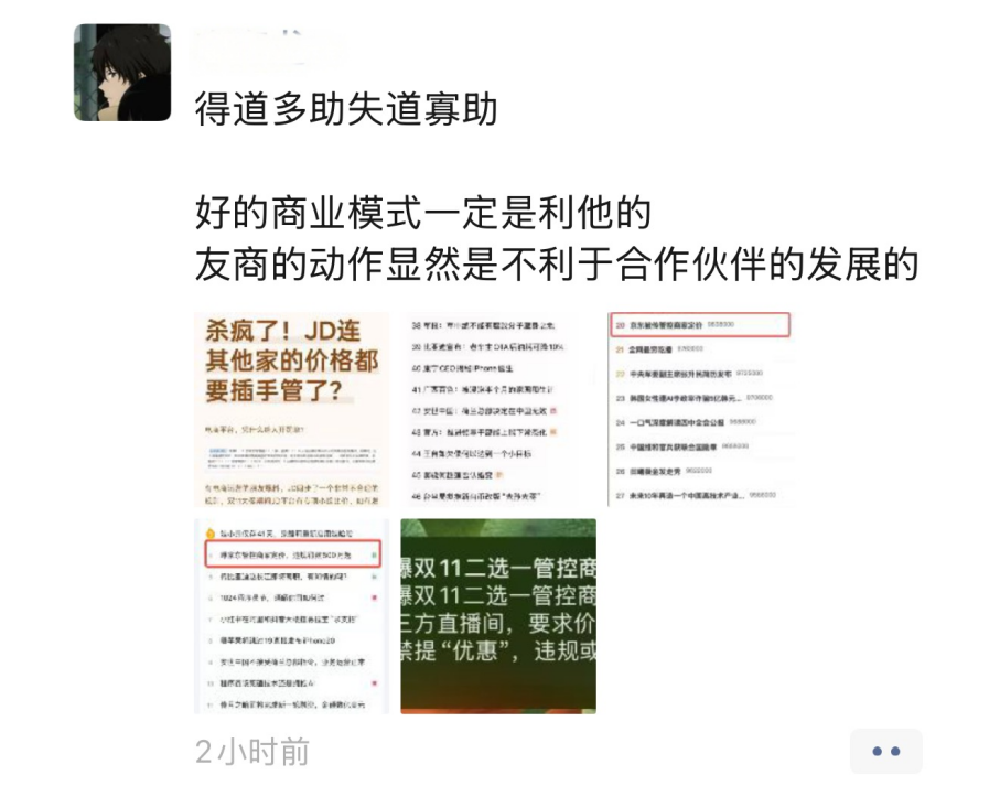 某平台高管在朋友圈发文称,“得道多助失道寡助,好的商业模式一定是利他的,友商的动作显然是不利于合作伙伴发展的。”