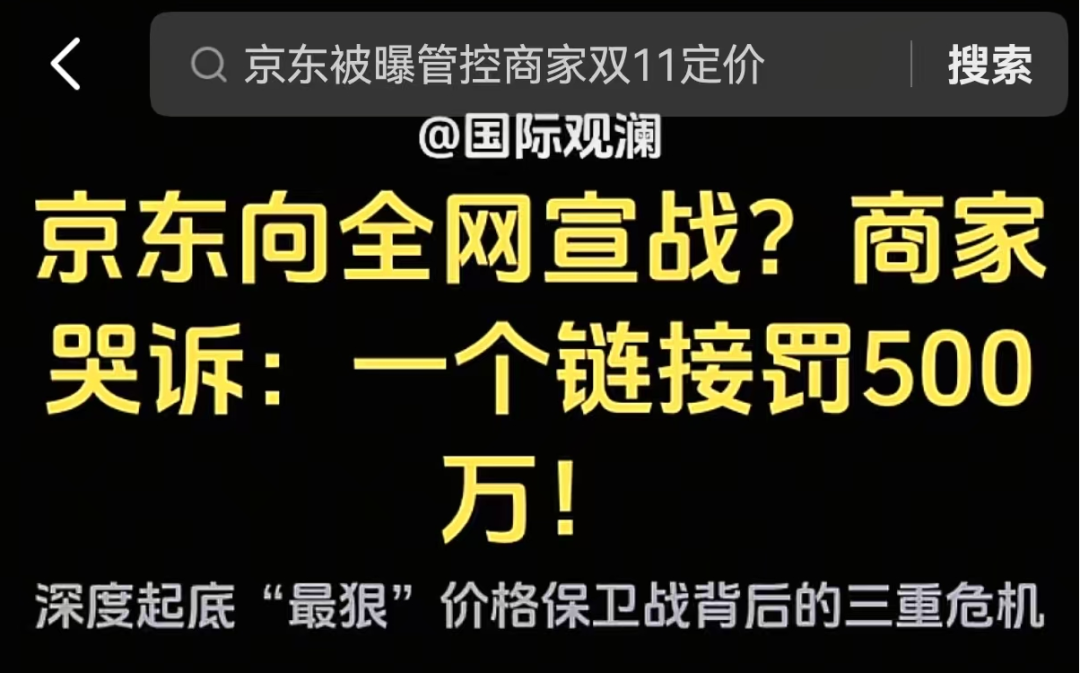 京东向全网宣战?商家哭诉:一个链接罚500万;京东慌了?今年双11把二选一玩出了新套路;京东急眼了!下令要求商家“不准提比我家便宜”……近日,抖音出现了大量关于京东双11政策的视频,“双11京东被吐槽二选一玩出新高度”成为抖音热门话题。