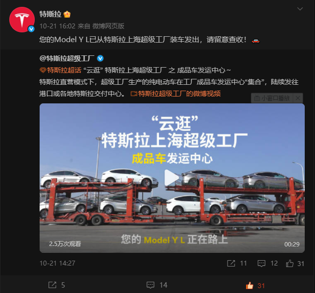 上周,特斯拉还专门宣布称,刚下线的大批量 Model Y L 已从上海超级工厂发往全国各地交付中心。