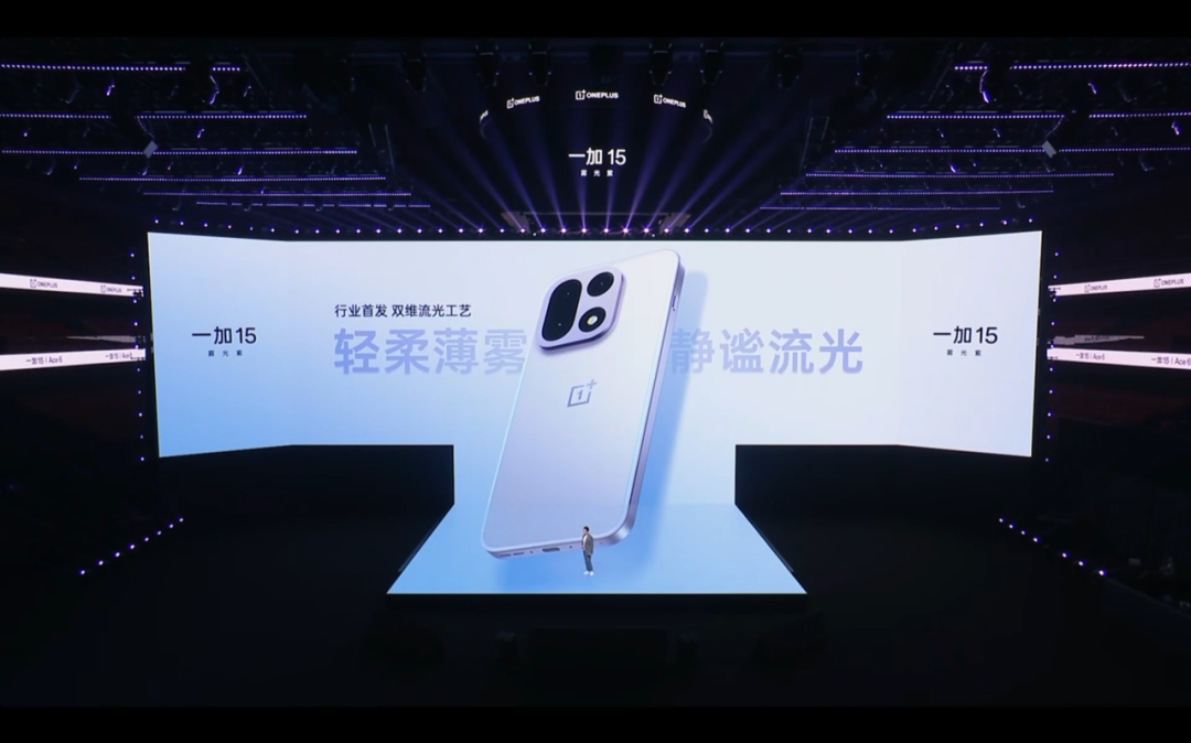 除了这个颜色之外,一加 15 还有两个颜色可选:"绝对黑" 和 "雾光紫"。分别用了不同的工艺。"绝对黑" 是一加所擅长的 AG 磨砂玻璃,而 "雾光紫" 则用了一个名叫 "双维流光工艺" 的技术。