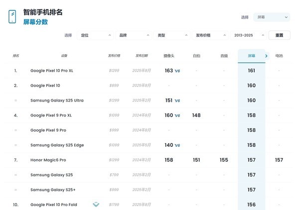 目前DxOMark屏幕测试榜单前五名分别是Google Pixel 10 Pro XL、Google Pixel 10、三星Galaxy S25 Ultra、Google Pixel 9 Pro XL、Google Pixel 9 Pro,几乎是被Google承包了。不过查看完整榜单也能发现,很多国产品牌的新品并未参与测试,尤其是下半年新出的旗舰产品,如果参与了,或许榜单也会发生微妙变化。