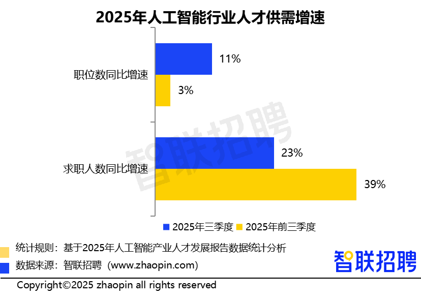 凤凰网科技讯 10月28日,智联招聘近日发布《2025年人工智能产业人才发展报告》,数据显示今年三季度人工智能行业招聘职位数同比增长11%,呈现出供需双增态势。