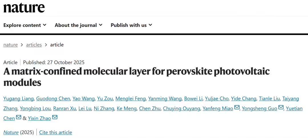 IT之家 10 月 28 日消息,据上海交通大学微信公众号消息,近日,《Nature》在线发表了上海交通大学环境科学与工程学院赵一新教授团队题为“A matrix-confined molecular layer for perovskite photovoltaic modules”的研究论文。该研究创新性地提出一种“基质限域分子层”型空穴传输层构型新概念,突破了传统自组装单分子层(SAM)型空穴传输层体系中面临的分子聚集、堆叠和结晶的本征限制,创制了分子适用性广、工艺推广性高的电荷传输层新技术路径,解决了基于自组装电荷传输层的钙钛矿光伏模组制备过程中面临的薄膜不均匀、界面不稳定难题。最终,通过与宁德时代 21C 创新实验室合作,该研究成功实现光电转换效率超过 20% 的 1 m × 2 m 大尺寸钙钛矿光伏模组,创造了当前该领域的世界纪录。