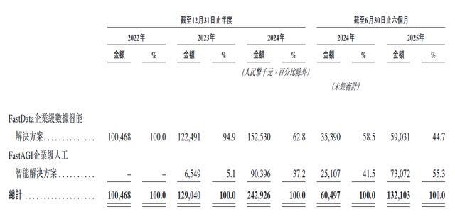 滴普科技主要从销售FastData企业级数据智能解决方案及FastAGI企业级AI解决方案获得营收。2022年-2025年上半年,FastData企业级数据智能解决方案分别贡献了该公司当年/期100%、94.9%、62.8%和44.7%的营收,而FastAGI企业级AI解决方案分别贡献了该公司当年/期0%、5.1%、37.2%和55.3%的营收。