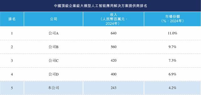 招股书中,滴普科技称,企业级AI应用解决方案市场规模庞大,2024年滴普科技的市场份额为0.6%。同期,在占据总市场规模15%的企业级大模型AI应用细分市场中,滴普科技的收入排名第五,市场份额为4.2%,这一数字预计将在2025年进一步增长到4.4%。