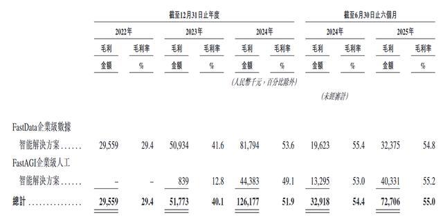 2022年至2025年上半年,滴普科技FastData企业级数据智能解决方案的毛利率分别为29.4%、41.6%、53.6%及54.8%;其FastAGI企业级人工智能解决方案的毛利率分别为空缺(未开展此项业务)、12.8%、49.1%及55.2%。综合来看,滴普科技整体的毛利率快速提升,同期毛利率分别为29.4%、40.1%、51.9%及55.0%。