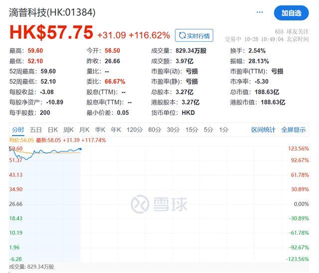 开盘后,截至发稿,滴普科技股价上涨116.62%,港股股价为每股57.75港元(约合人民币52.87元),市值为188.63亿港元(约合人民币172.68亿元)。