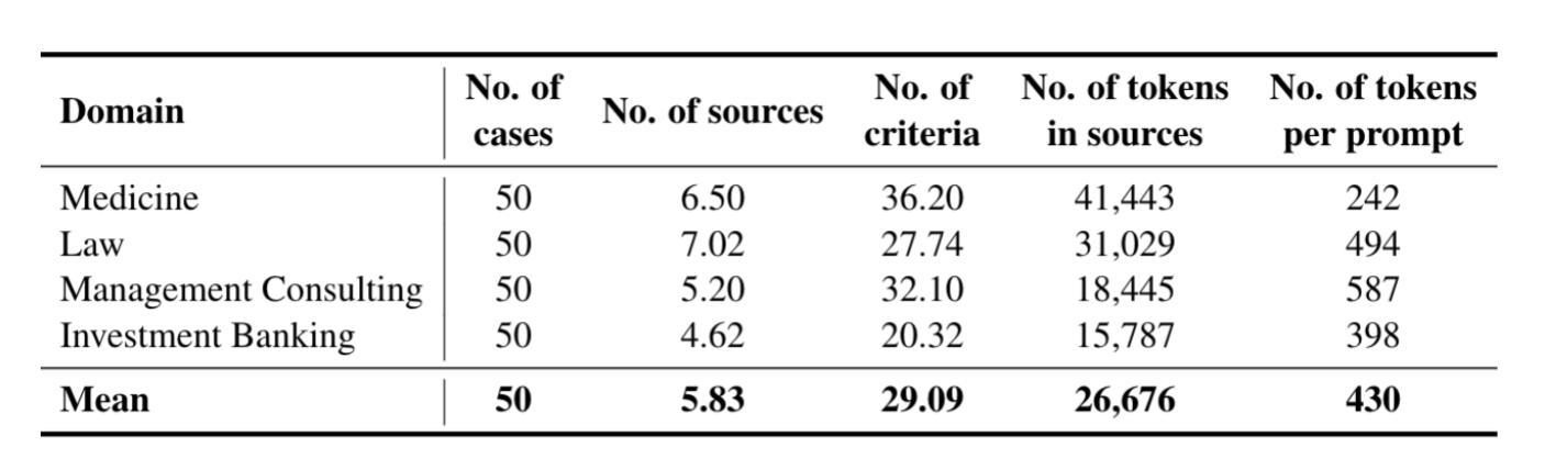 APEX v1.0由200个案例组成,平均分布在投资银行、法律、咨询和医疗中。每个案例都由提示(任务描述)、来源(完成任务所需的信息)和评分标准(对模型响应进行评分的标准)组成。