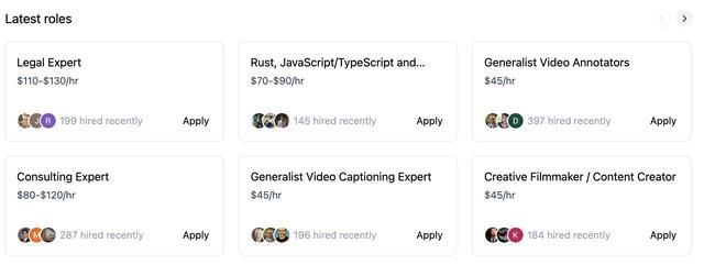帮助他们赚得第一桶金的业务是AI招聘,其通过AI筛选简历,快速为候选人匹配岗位。今年2月,基于这一庞大的专业人才网络,Mercor开辟了数据标注、大模型评估业务,也就是与现有的专家人才签订合同,在短期内帮助大模型公司进行数据标注、提供专业反馈。如今,其管理的专家总数已达到30000名,所有专家的日薪总计超过150万美元(折合人民币约1065万元)。