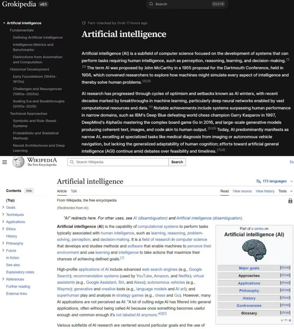 智东西打开了多条Grokipedia与维基百科的相同词条,可以看到,对人工智能这一概念,Grokipedia与维基百科的内容在叙事逻辑和具体表述上都有大量相似之处。