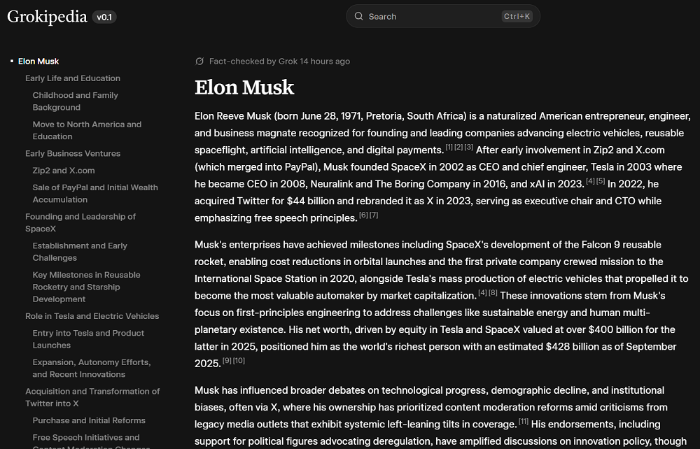 智东西10月28日报道,今天,马斯克旗下的大模型独角兽xAI宣布推出一个名为Grokipedia的百科全书网站,每个条目都由Grok进行了“事实核查”。这一网站此前曾被马斯克封为“维基百科替代品”,此次他更是发推称:“0.1版本也比维基百科好。”