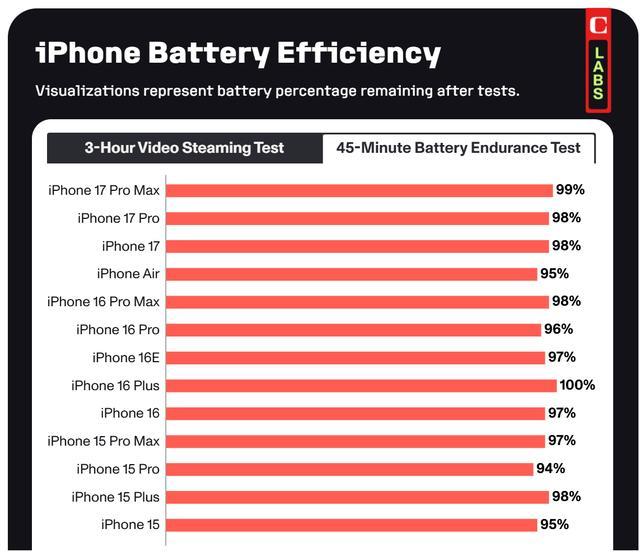 在 CNET 进行的标准化实验室测试中,iPhone Air 的续航表现喜忧参半。其中一项测试模拟了严苛的视频播放场景:在屏幕最高亮度下,通过 Wi-Fi 连续播放三小时视频。