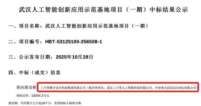 智东西10月29日报道,10月28日,武汉人工智能创新应用示范基地项目(一期)中标结果公示,三六零数字安全科技集团有限公司中标,投标总价为1.32亿元。