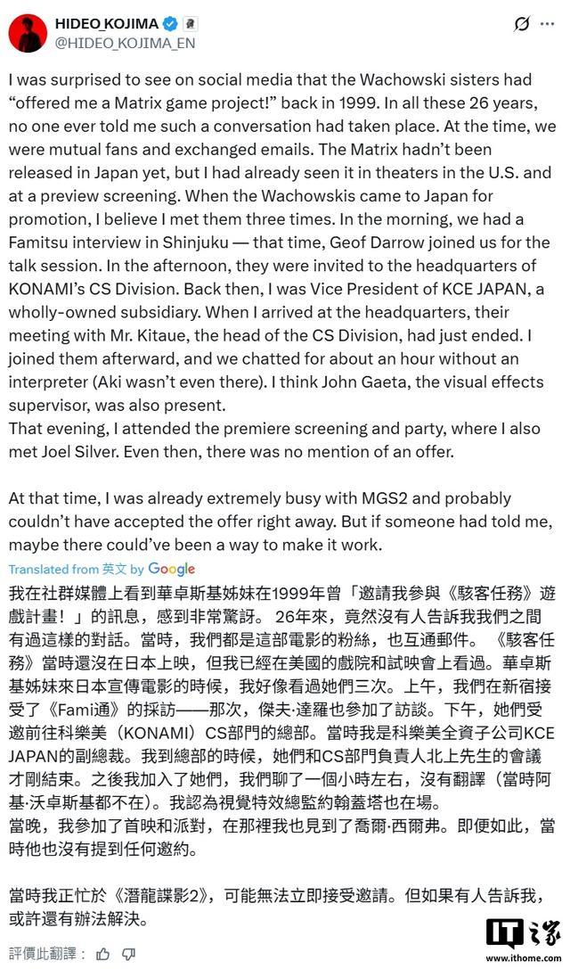 IT之家 10 月 29 日消息,小岛秀夫今天在 X 平台发文,辟谣“1999 年科乐美拒绝《黑客帝国》导演邀约制作游戏”事件。
