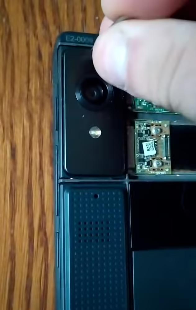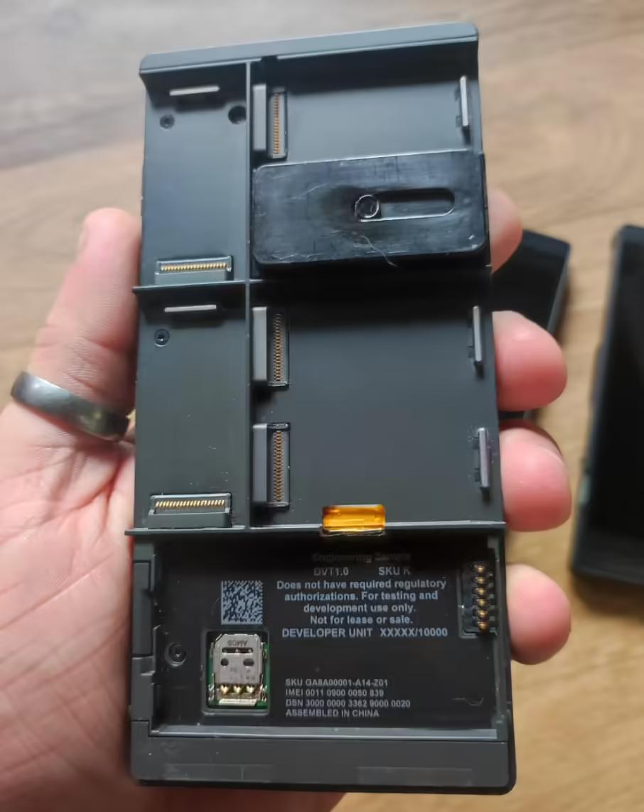 根据他发布的视频和图片可以看到,他手上原型机的“Ara”Logo 是比较新的版本,其外观与 2016 年流传出的工程机不同,因此可能是晚期版本,这些手机的后盖均可以装配电池、摄像头、扬声器等模块。