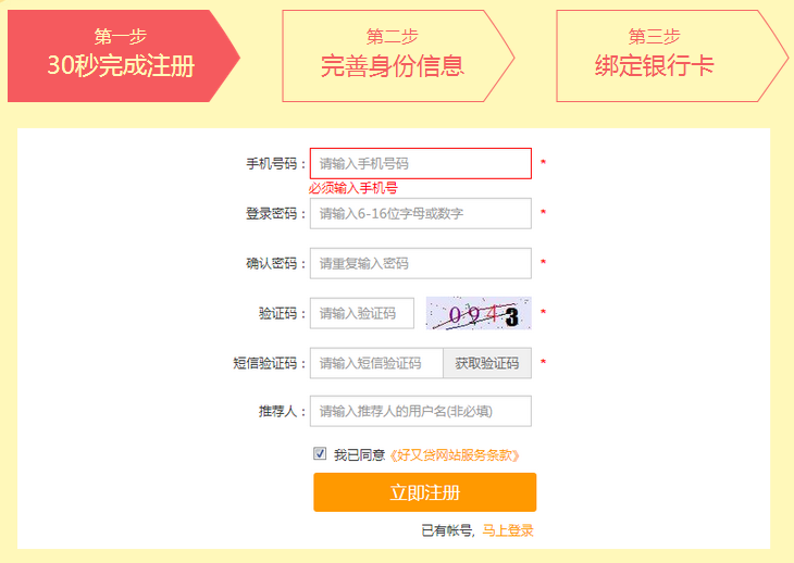 好又贷注册方法图解 好又贷作为一家有干爹支撑的上市公司,一出来就受到人们的广泛欢迎。那么,好又贷如何注册呢?小编来为大家详解。 第二步、完善个人信息,实名认证。 第三步、绑定个人银行卡,完成注册。 Published by 风君子 独自遨游何稽首 揭天掀地慰生平 View all posts by 风君子