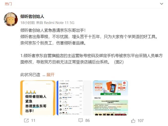今年9月,影音电器品牌“倾听者”的创始人在社交平台公开喊话,称旗下京东自营旗舰店遭遇平台采销人员单方操作,主运营账号密码及绑定手机号被修改,导致店铺运营全面瘫痪。