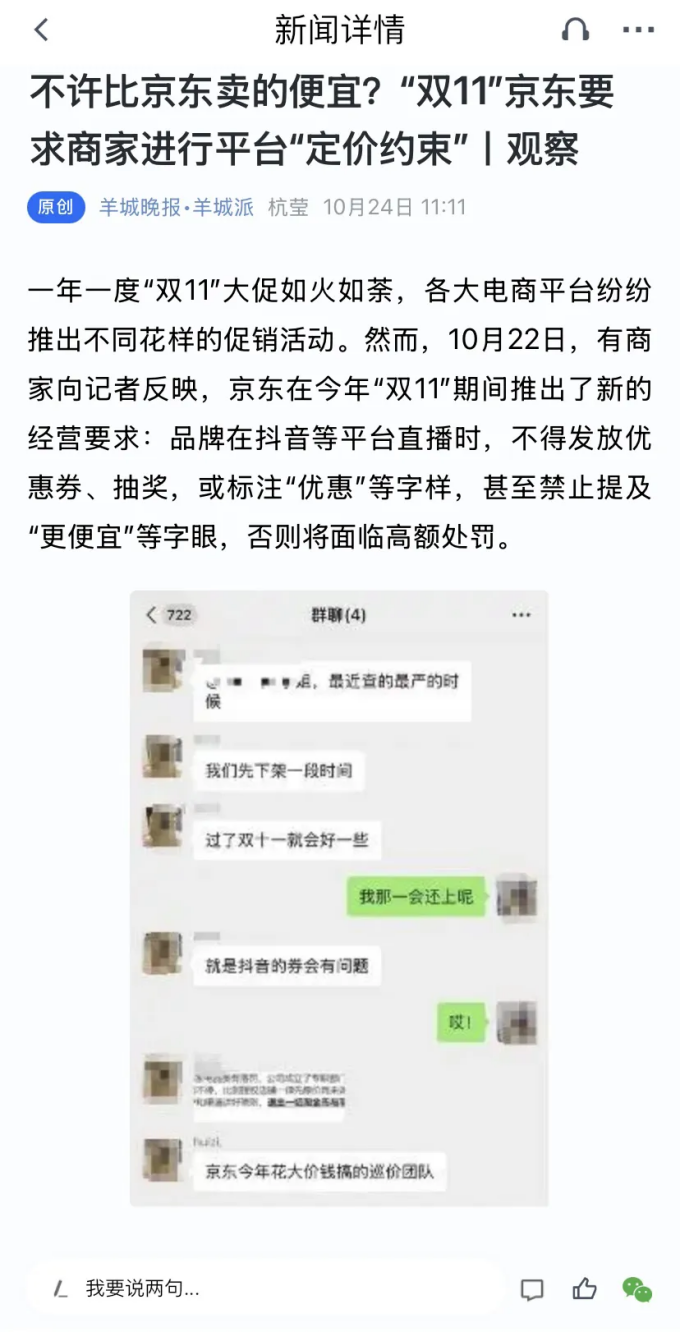 近日,据羊城晚报等多家媒体报道,京东被曝疑似在双11期间干涉商家在其他平台的自主经营,限制商家在抖音等平台直播间的促销形式,包括不得在直播中抽奖、不允许发放优惠券、不能提及价格优惠等。
