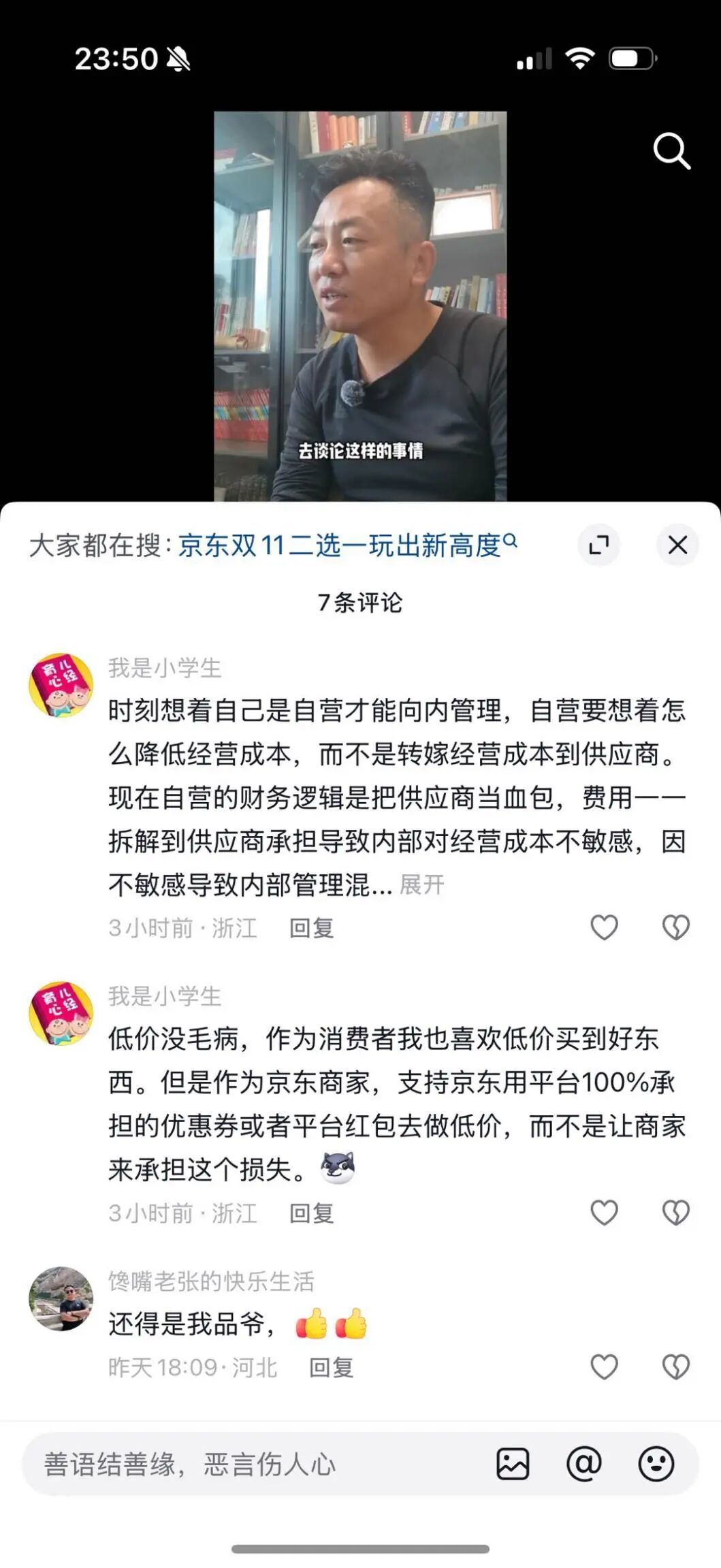 不过相较于京东员工的自我感动,商家似乎并不买单,有商家直接在王立品的视频中留言:你可以维护京东用户利益,但请用京东自己的成本,而不是转嫁给我们。