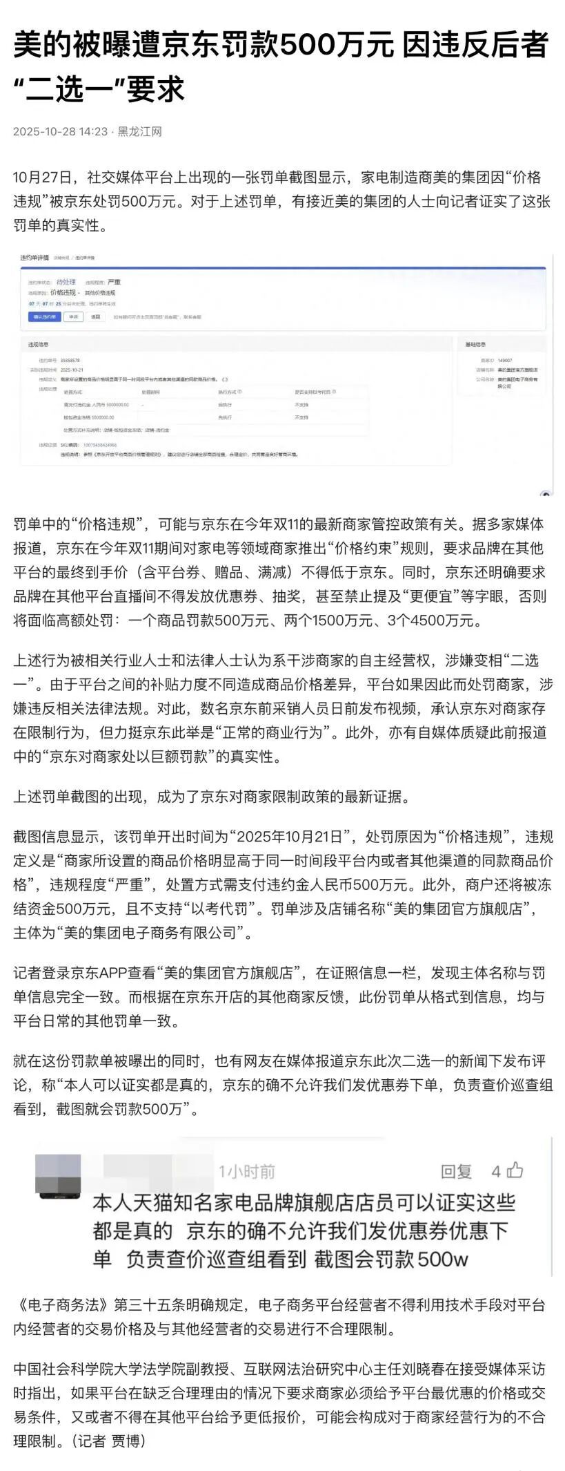 此外,据黑龙江网报道,网传家电制造商美的集团因“价格违规”被京东处罚500万元。“有接近美的集团的人士向记者证实了这张罚单的真实性。”随后,又有媒体围绕该罚单进行了采访报道,据“知情人士”透露,确实有过这一罚单,但后来取消。