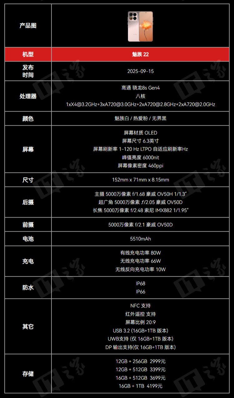 魅族 22 手机于今年 9 月 15 日发布,该机搭载第四代骁龙 8s 处理器、配备 1.5K 高刷无界屏(0.8mm 四等边“独白”面板)、采用 5000 万像素广角 + 5000 万像素 3 倍潜望长焦 + 5000 万像素超广角 + 5000 万像素前置镜头组合,定价 2999 元起。
