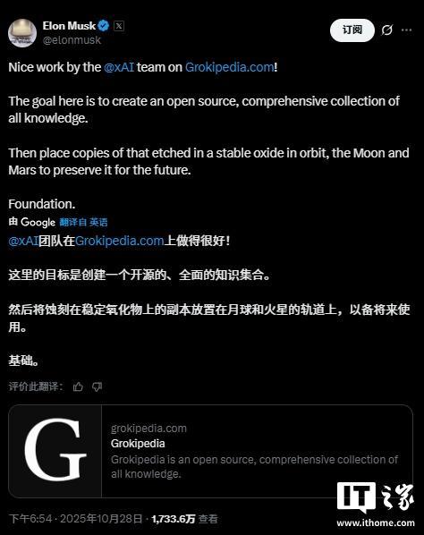 IT之家 10 月 30 日消息,埃隆・马斯克昨日宣布了一项最新计划,他在社交平台 X 上发文表示,xAI 公司推出的全新开源百科全书“Grokipedia”,将被刻录在稳定的氧化物介质上,并发射进入太空永久保存。