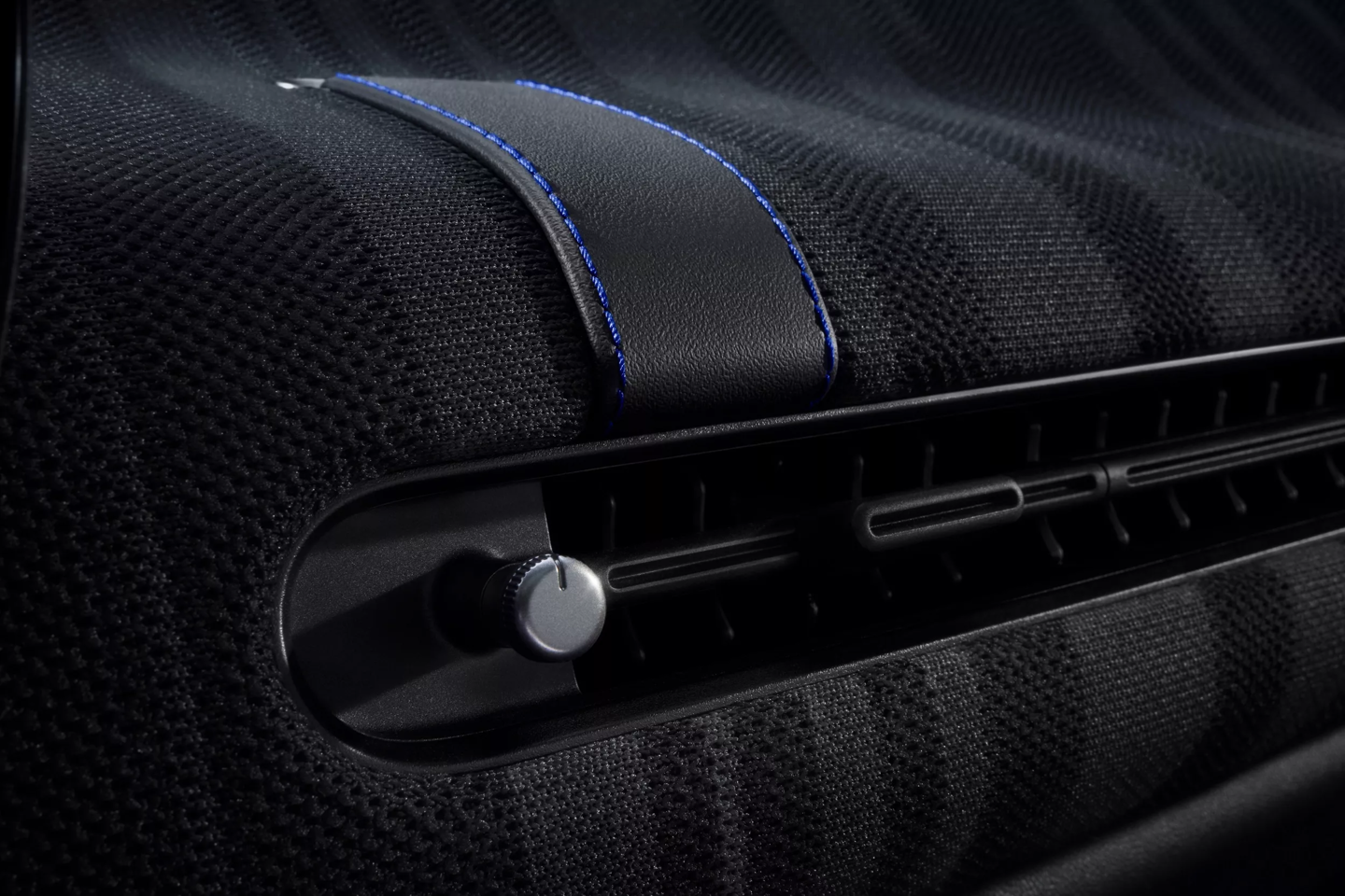 座舱内配有“夜影蓝”(Nightshade Blue)运动座椅,其材质由 Vescin 人造皮革与双色织物拼接而成。仪表板和门板处也采用了特殊的针织工艺饰面,方向盘上则点缀着“签名条条纹”,脚垫上甚至还印有一只风格化的兔子图案。