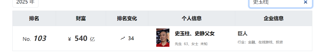 其中,巨人网络的创始人史玉柱及其女儿史静凭借540亿元的身家,在榜单中位列第103名。