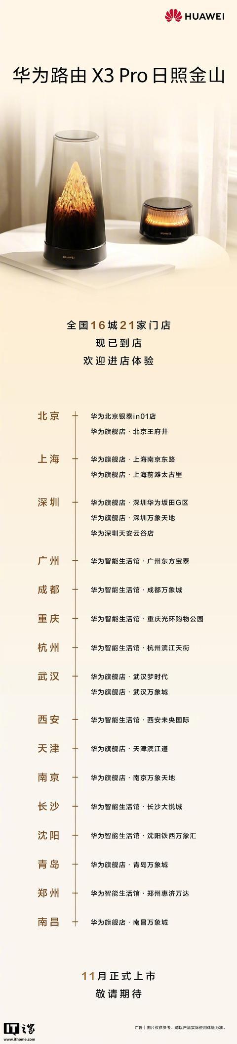 IT之家 10 月 31 日消息,华为终端宣布旗下“华为路由 X3 Pro”将于下月上市,该产品目前已进驻全国 16 城 21 家门店,覆盖北京 / 上海 / 深圳 / 广州 / 青岛 / 长沙 / 南京等城市,IT之家整理具体门店如下: